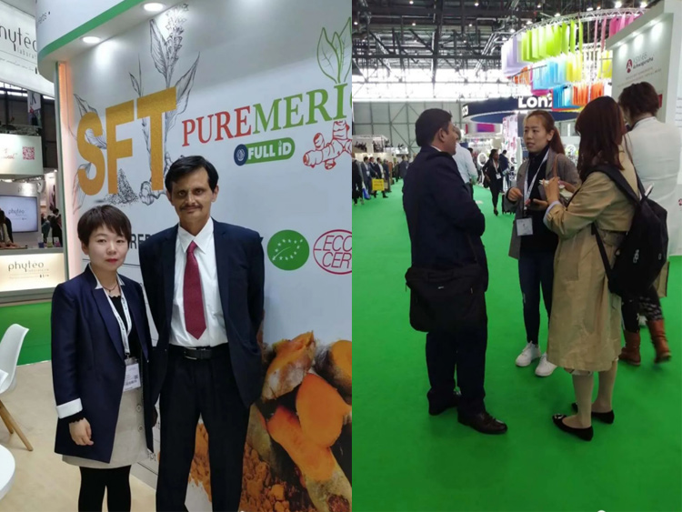 图一:2019年印度知名姜黄素公司与sr bio 相聚瑞士,并达成项目合作合影留念。图二:sr bio公司销售人员正在展会和客户交流产品信息